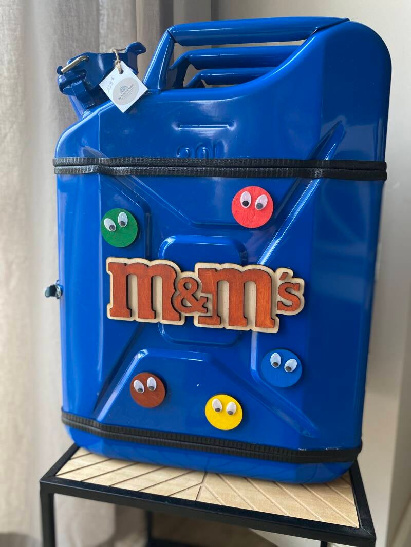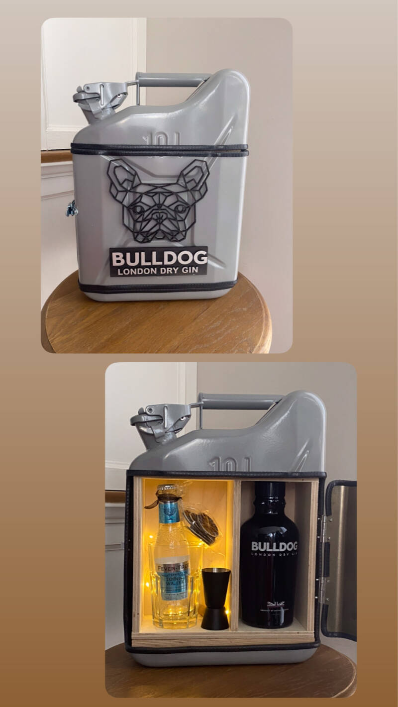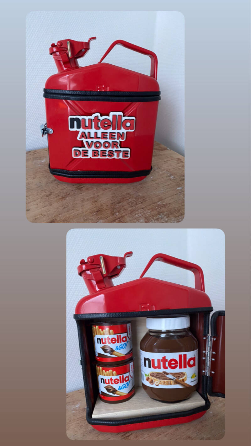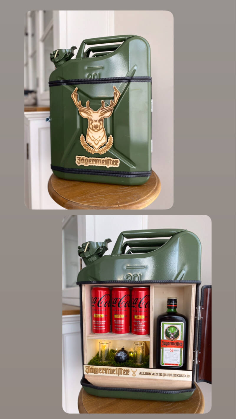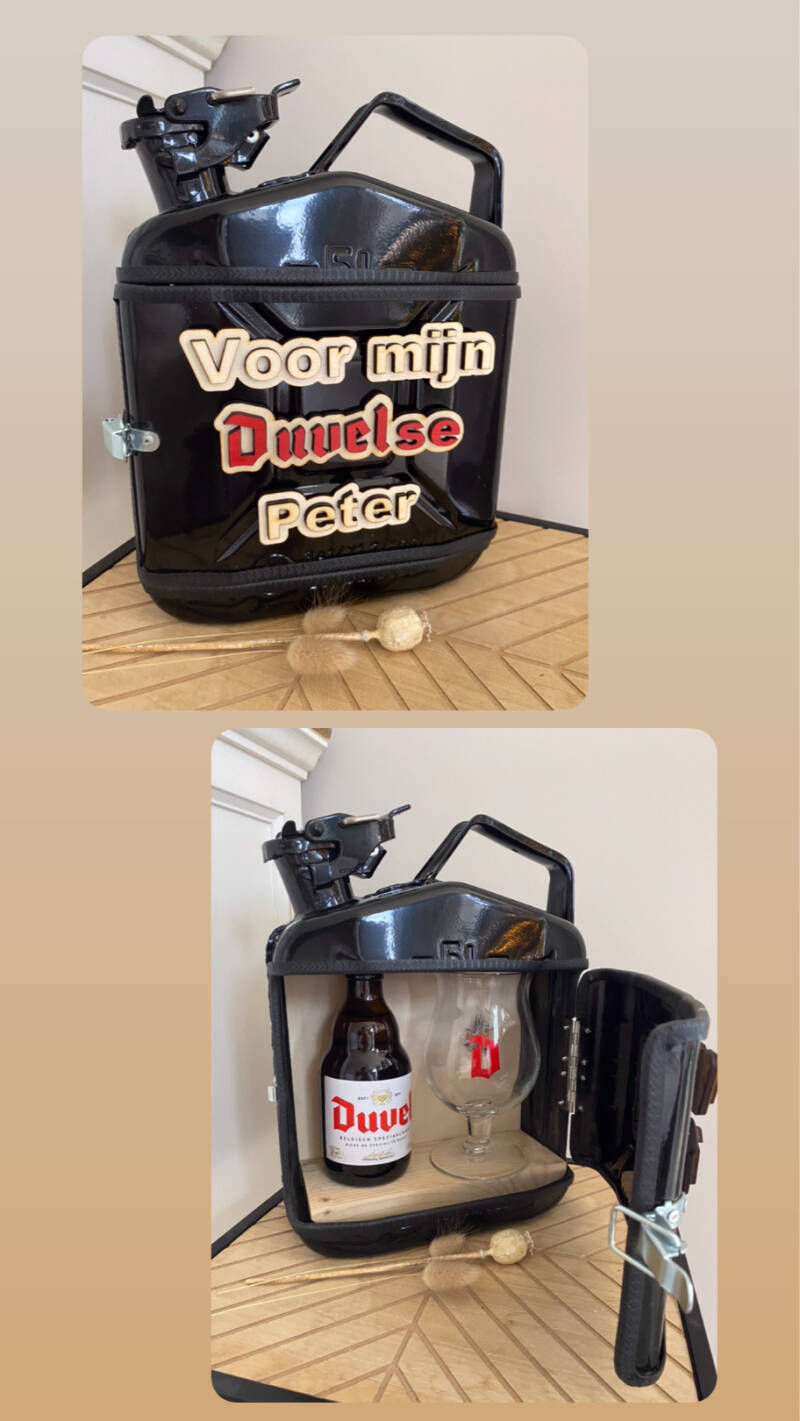 Je kan deze bestellen met tekst op het bakje en/of tekst op de fles