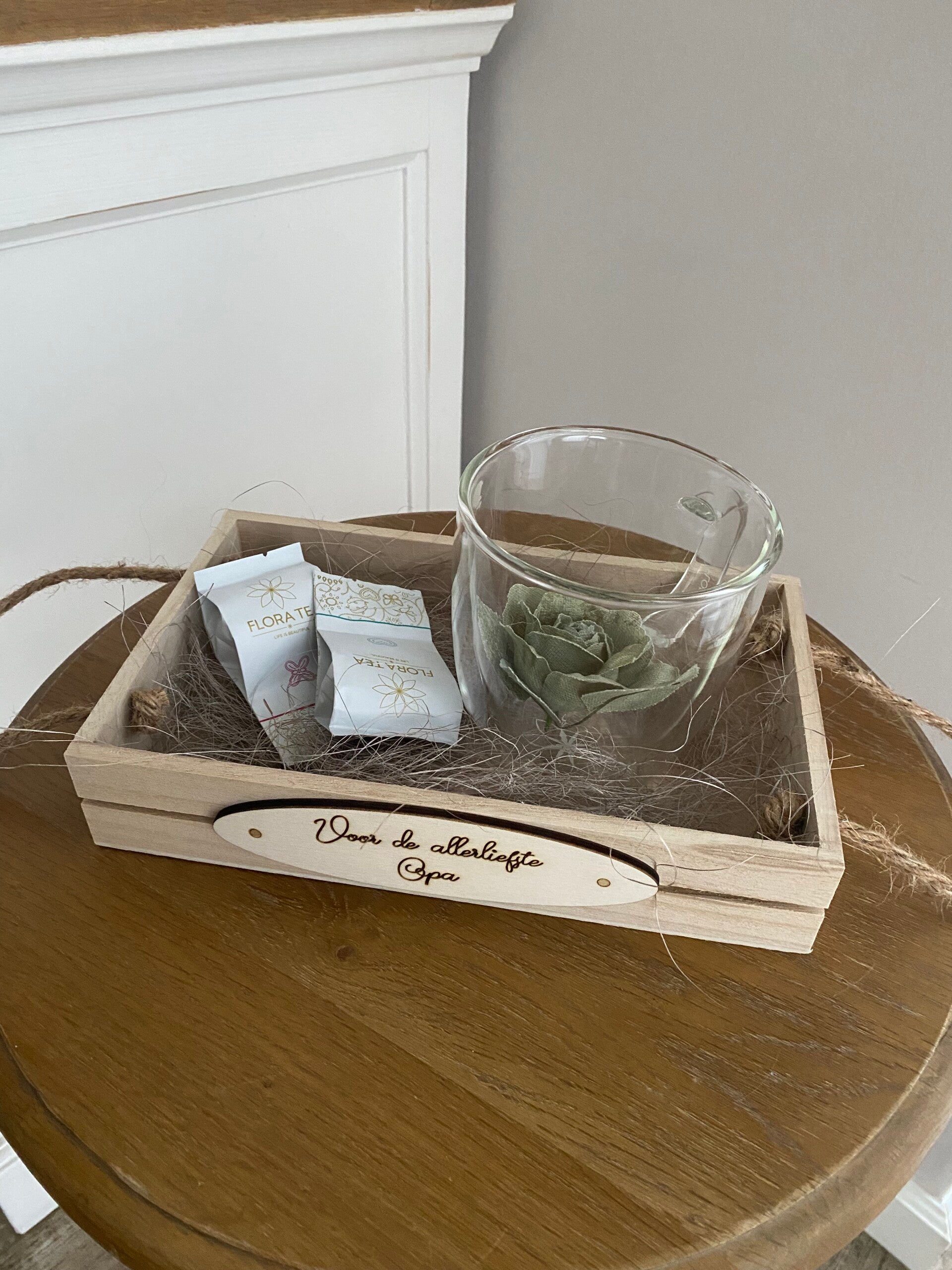 Onze box met 2 zakjes thee met een magische bloem samen met onze dubbelwandige mok 400ml