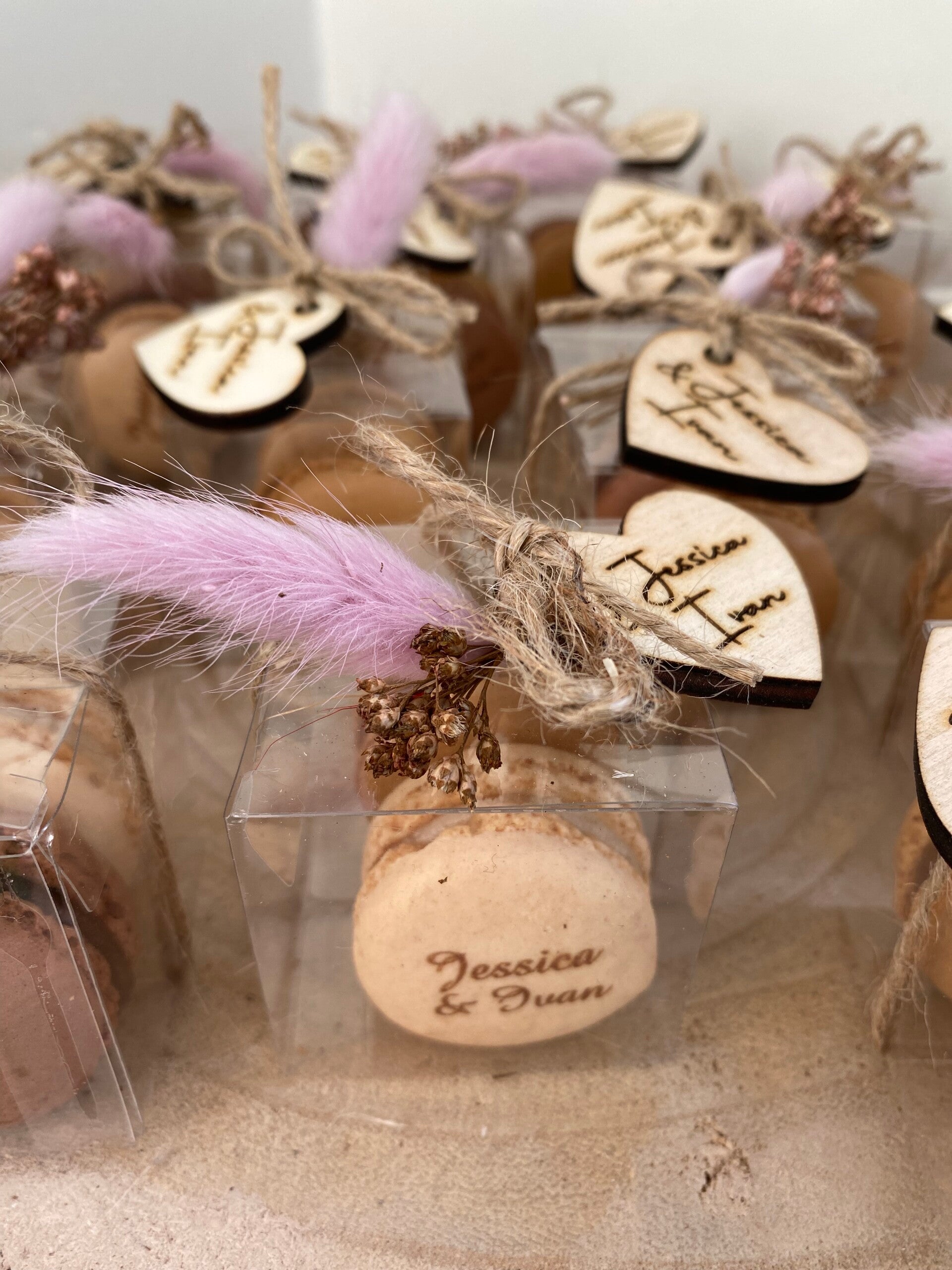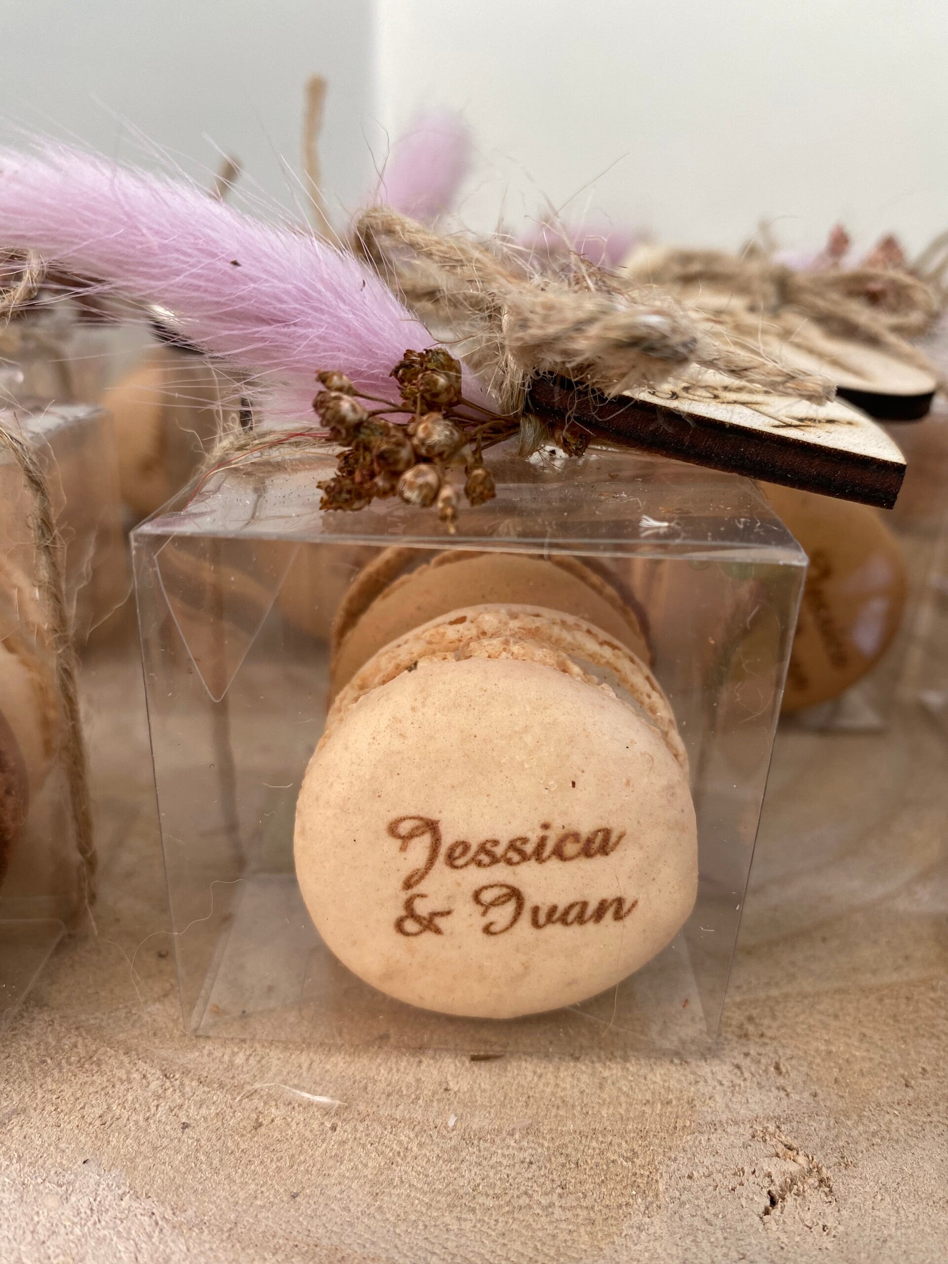 Je kan enkel de kleur van de droogbloem kiezen de macarons , strik en Lebel zijn naturel