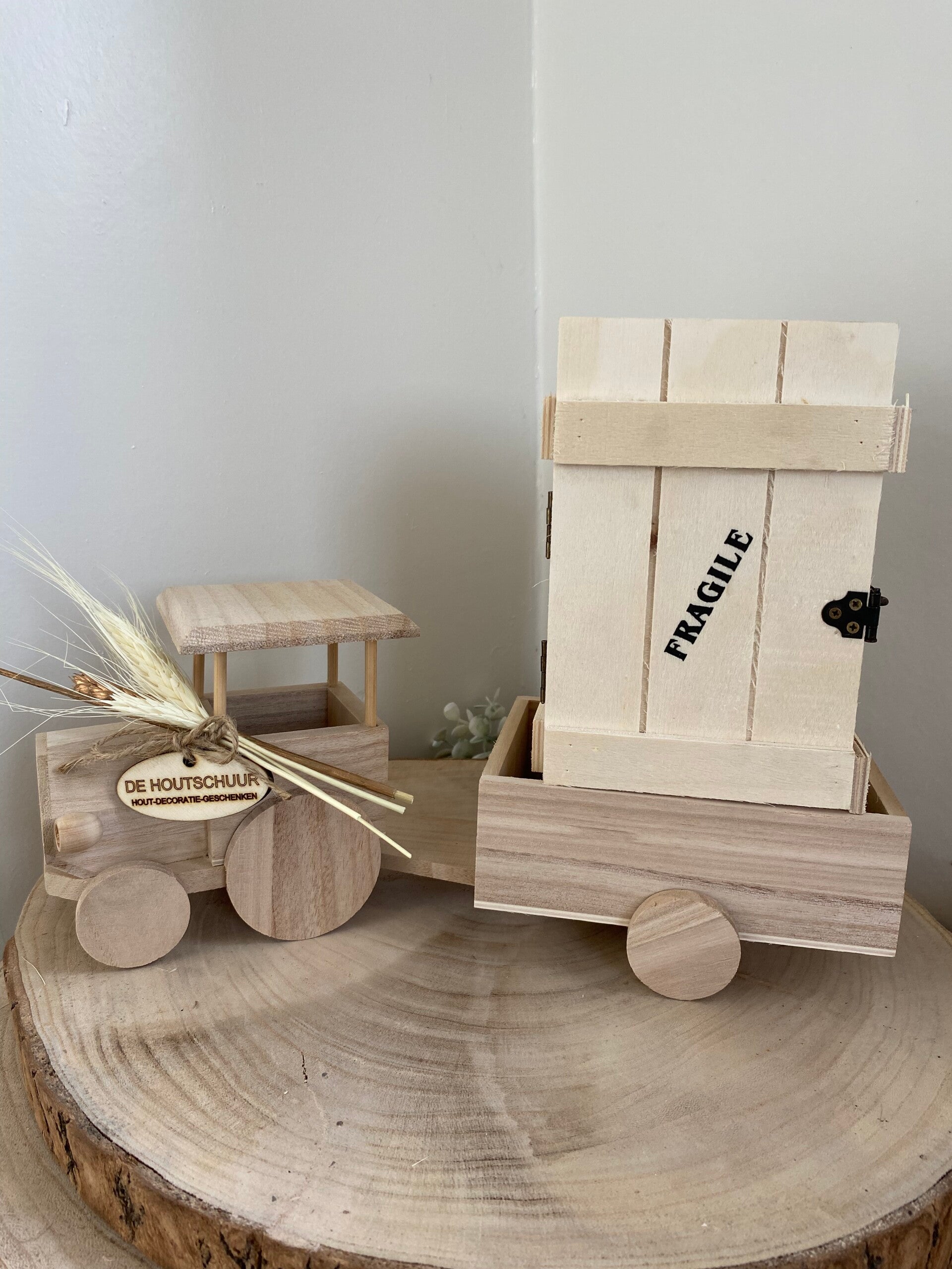 Deze houten tractor kan je personaliseren met een vraag of een naam