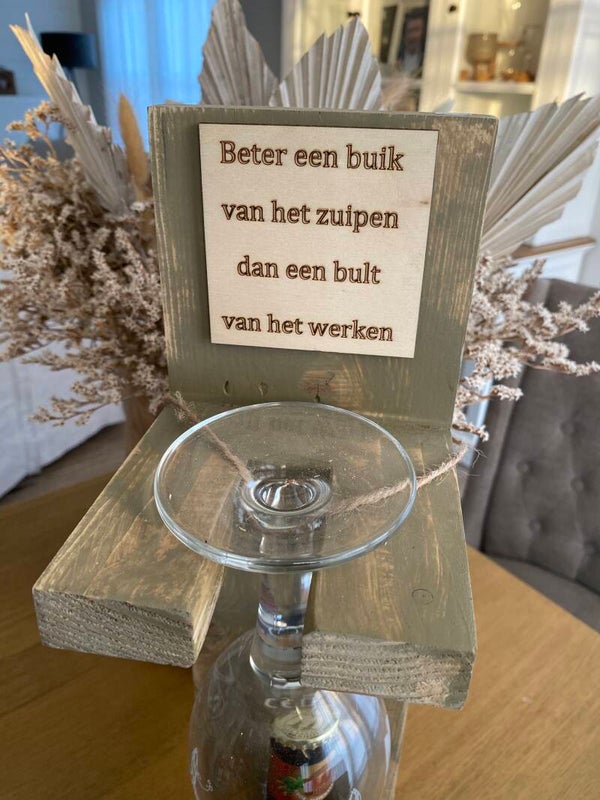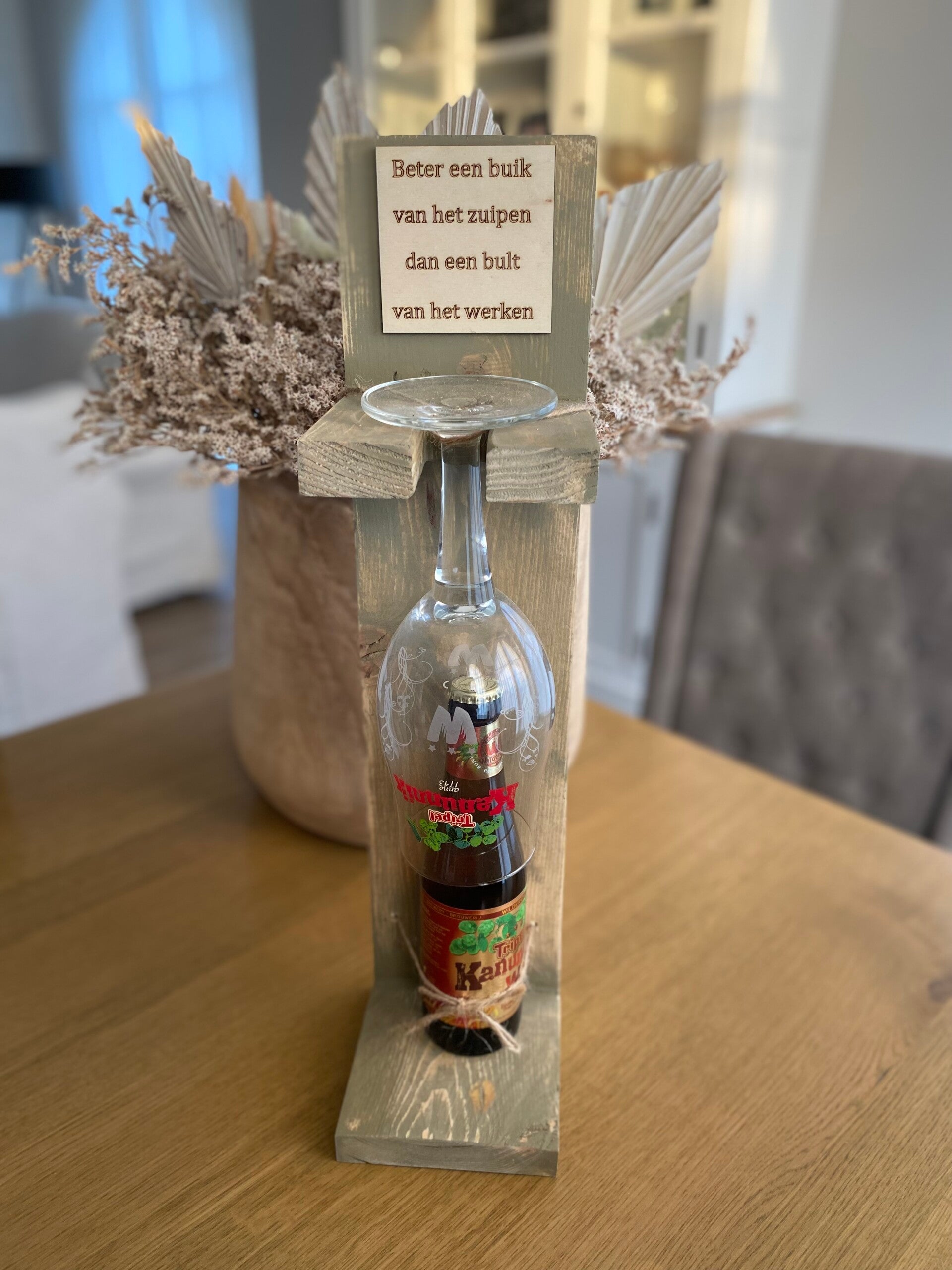 Deze staander bestaat uit 1 glas en 1 flesjebier met tekst naar keuze