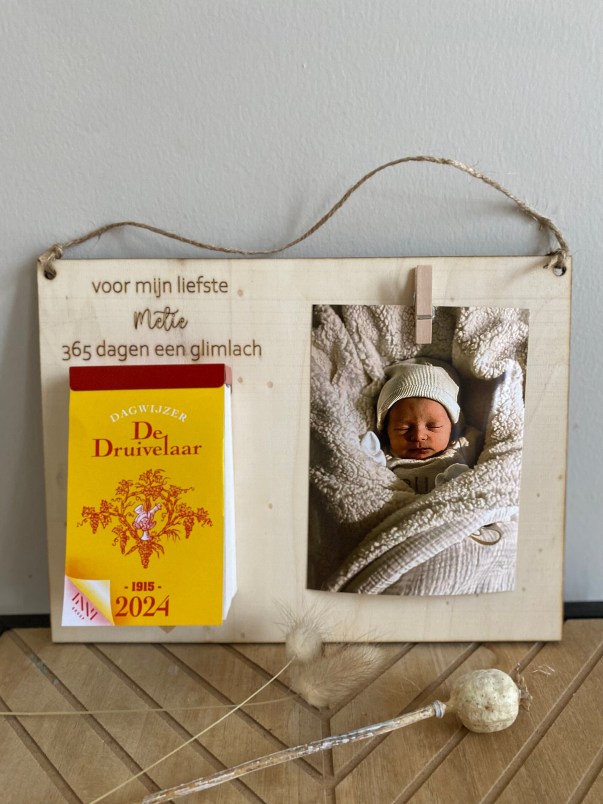 Kalender met plaatst voor een foto, boven de kalender kan een eigen gekozen tekstje gegraveerd worden