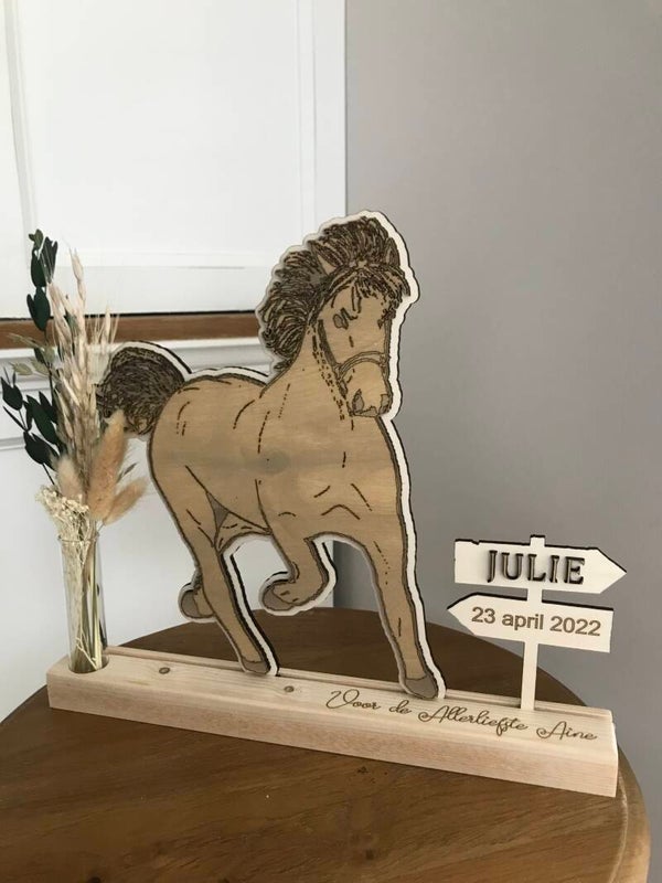 Deze paarden stand met vaasje, springendpaard en naam op hek of