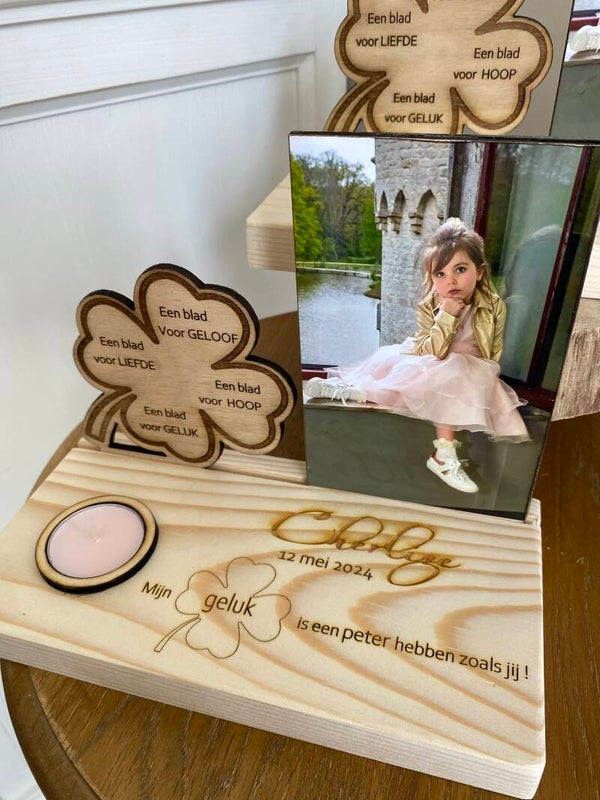 Deze foto kader is met kaarsje en een klavertje 4 wensen