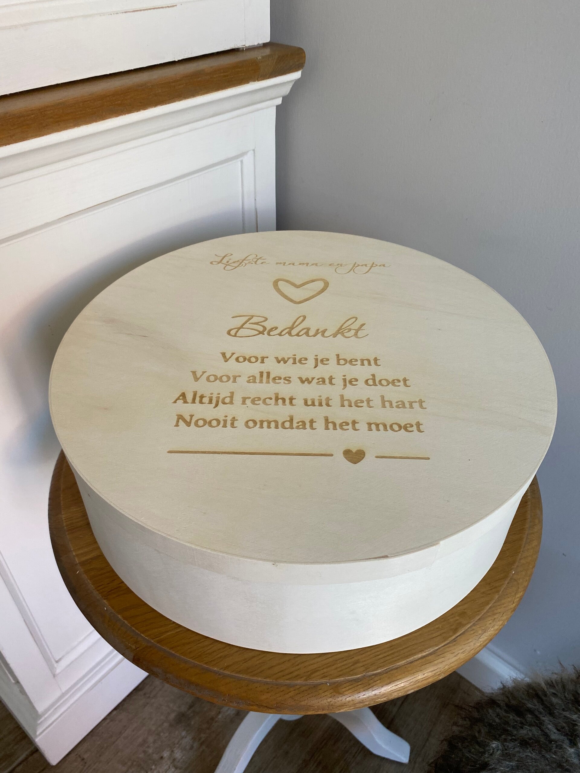 Deze ronde geschenkbox in hout kan besteld worden met vulling of zonder vulling